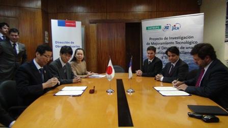 Junto a las principales directivas de la Dirección de Obras Portuarias el Director Nacional, Ricardo Tejada, firmó junto al presidente adjunto de Puertos de Japón, Sr Takashi Owaki, un convenio de cooperación que permitirá desarrollar un intercambio integral en cuanto a los conocimientos de ambos países. Esta iniciativa también se enmarca en el “Proyecto para el desarrollo de comunidades con resiliencia al tsunami” el cual busca generar diversas estrategias para responder ante posibles fenómenos de tsunami en nuestro país. En ese contexto el Director Nacional de Obras Portuarias, Ricardo Tejada, destacó “estamos orgullosos de celebrar este convenio y poder intercambiar directamente con Puertos de Japón, toda la información que sea necesaria para garantizar la seguridad de todos los ciudadanos, somos países que compartimos una realidad sísmica compleja lo cual nos sitúa ante un escenario en que debemos intercambiar ideas y conocimientos para estar preparados”. Por su parte el presidente adjunto de Puertos de Japón, Takashi Owaki, destacó que “hoy estamos trabajando fuertemente en el desarrollo de nuevos planes de coordinación entre el estado y los gobiernos locales con el fin de actualizar nuestros procedimientos”. En ese contexto la comisión de visita Japonesa destacó ya se están preparando al igual que nosotros en el desarrollo de planes que categorizan nuevos tipos de tsunamis, donde de acurdo al silecio sísmico ya estipulan olas de 35 metros de altura. Cabe señalar que durante las exposiciones también se mostró el avance del grupo 4 del Proyecto Tsunami, liderado por el profesional de la DOP Ariel Grandon, quien informó que se han realizado reuniones de coordinación en el nivel central con el Ministerio de Transporte, el Sistema de Empresas Públicas, la DIRECTEMAR y la Universidad de Valparaíso. Por otro lado también se ha trabajado a nivel regional en el contexto de la recopilación de información con la Empresa Portuaria de Iquique y su concesionario, la ONEMI regional, la Capitanía de Puerto y la Municipalidad de Iquique entre otros actores.